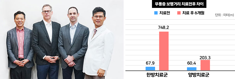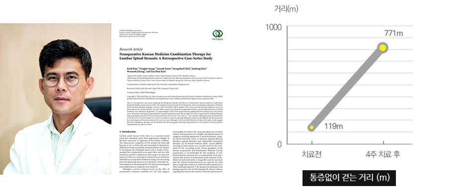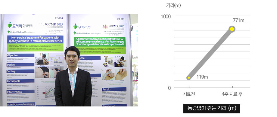 743명의 척추관협착증 환자 중에서도 통증 없이 평균 60m 밖에 걷지 못하는 말기 척추관협착증 환자만을 선별, 모커리 한방재활치료 전과 치료 종료 6개월 후 호전 상태를 관찰한 결과, 한방치료 이후 통증 없이 걸을 수 있는 거리가 11배 이상 증가하였으며 허리와 다리통증이 완화되었습니다. 이는 척추관협착증이 수술 없이도 호전될 수 있다는 한방치료의 효과를 객관적으로 입증한 연구라 할 수 있습니다. 특히 이 연구는 한방치료군과 양방치료군을 무작위로 나누어 비교한 무작위 대조군 연구이기 때문에 연구의 신뢰도가 굉장히 높습니다.