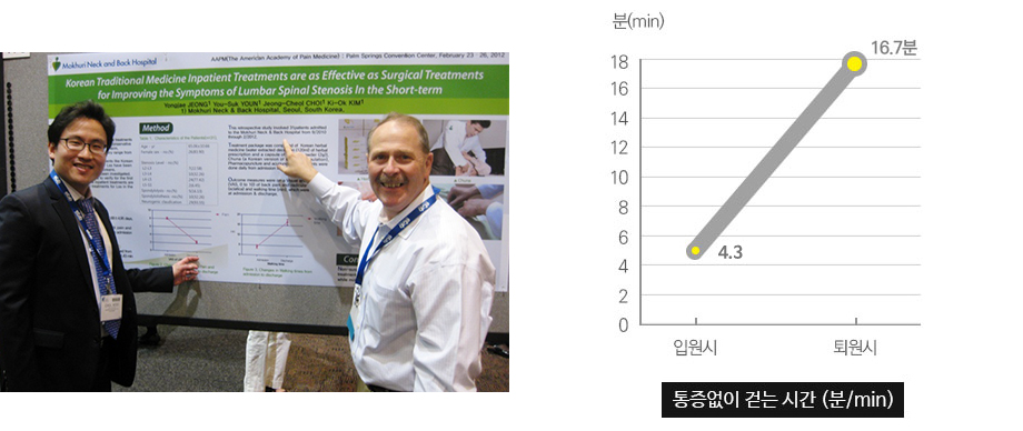 모커리한방병원의 비수술 척추관협착증 치료는 단기간 뿐만 아니라 중장기적으로 치료효과가 지속될 수 있다는 것을 끊임없이 연구하고 있으며, 객관적인 검증을 거쳐 밝혀진 연구내용을 국제학회 및 논문에 발표하고 있습니다.