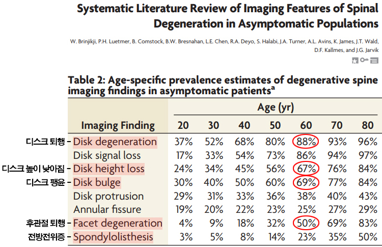위 논문은 2015년에 발표된 논문인데, 이 연구는 허리 관련 별다른 통증 등의 증상이 없는 사람들을 대상으로 영상학적 검사를 시행한 것입니다. 그런데 위 논문에서 60대 이상을 보면, 디스크 높이가 낮아지고, 디스크가 호떡처럼 눌리며 팽윤되고 밀려나오고, 후관절이 퇴행되어 두꺼워지고, 전방전위증이 있는 등 척추관을 좁게 만드는 요인이 있는 사람들의 비율이 아주 높은 것을 볼 수 있습니다. 이런 사람들이 별다른 증상이 없는 것입니다. 70, 80대로 가면 척추관을 좁게 만드는 요인이 있는 비율이 훨씬 더 높아지지만, 증상이 없다는 말입니다.