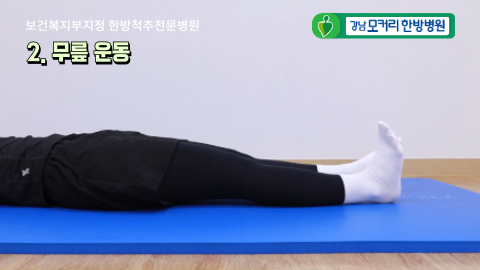 한쪽 무릎을 구부렸다 펴는 이 동작을 10-20회 정도 반복한 뒤, 운동한 쪽의 다리를 바닥에 편안하게 내려놓고 반대쪽 다리도 똑같이 해주시면 됩니다. 이 무릎 운동을 하실 때 주의사항은 두 다리를 동시에 들어올리면 허리에 부담이 되기 때문에 반드시 한쪽 다리씩 따로따로 운동하셔야 합니다. 그리고 무릎을 가슴 쪽으로 당길 때 절대로 어깨 쪽에는 힘이 들어가지 않도록 해주시길 바랍니다.