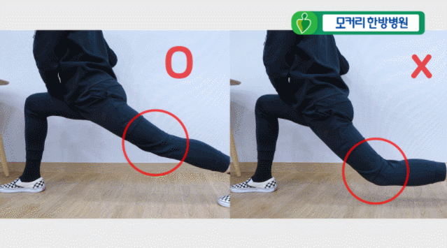 이때 뒤로 뻗은 왼쪽 다리의 무릎이 구부러지지 않아야 스트레칭이 더 잘 됩니다.