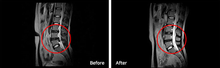모커리는 ABCDE 치료를 통해 파열된 디스크로 흡수될 수 있도록 도와주는 치료를 진행합니다. 오른쪽 MRI 사진은 치료 6개월 후 촬영된 모습으로, 파열된 디스크가 깨끗하게 흡수된 것을 확인하실 수 있습니다.