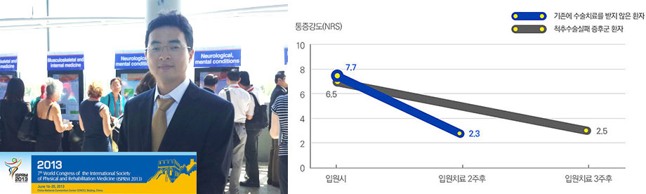3년 이내 추간판탈출증(허리디스크) 수술을 받은 척추수술실패증후군(FBSS: FAILED BACK SURGERY SYNDROME) 환자를 대상으로 통증이 70% 이상 감소하는데 걸리는 치료기간을 비교 분석했습니다. 이때 치료를 받지 않고 재발한 환자는 평균 2주, 척추수술실패증후군 환자는 평균 3주로 수술치료를 받지 않은 환자가 수술치료를 받은 환자보다 30% 이상 빠르게 치료된다는 연구결과를 확인했습니다. 해당 연구는 2013년 6월 세계재활의학회(ISPRMM)에 공식 발표하였습니다.