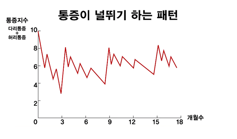 그런데 현실에서는 이런 모범적인 회복 그래프가 아닌 경우도 많습니다. 위 그래프와 같이 시간이 가면서 통증이 널뛰기하는 경우도 있습니다. 이런 경우는 허리신경주사를 맞고 통증이 줄었다고 관리를 소홀히 하고 무리한 활동을 하거나 심한 운동을 했을 경우가 대부분입니다. 허리디스크 회복기간 중 회복패턴에 대한 더 자세한 내용은 '허리디스크 자연치유 실전편 2탄 - 회복기간 및 회복패턴 잘 알기' 영상을 보시길 바랍니다.