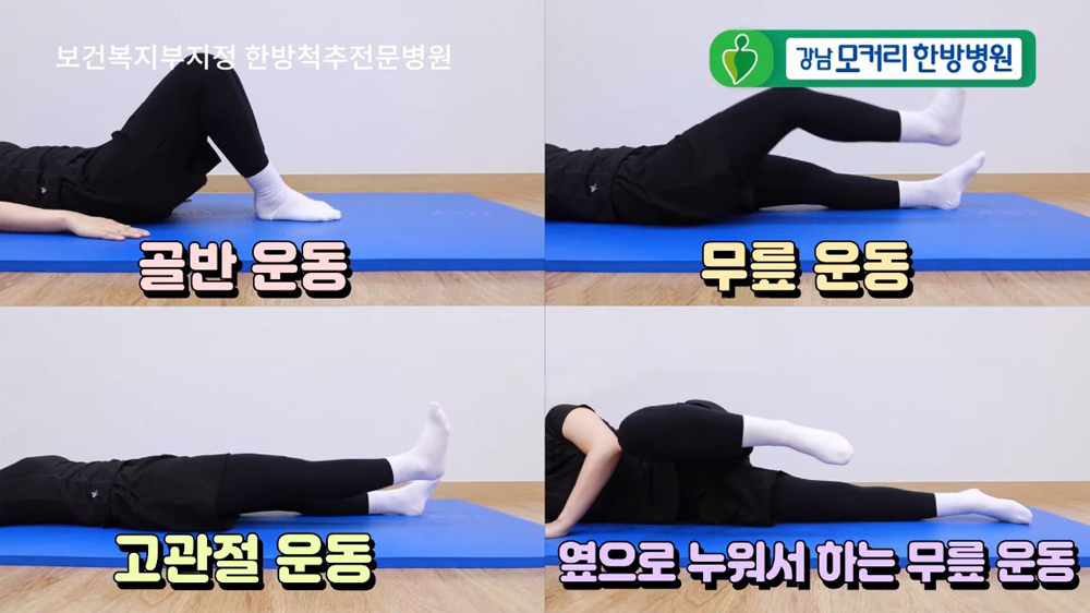 그럼 어떤 운동을 해야 되느냐? 허리에 힘이 들어가지 않으면서도 부드럽게 뭉친 근육을 풀어주고 순환시켜주고, 또 근육의 균형을 맞춰주고, 떨어진 근육의 기능을 회복해주는 운동들, 그게 바로 저희가 만들어놓은 누워서 하는 4가지 운동, 골반 운동, 무릎 운동, 고관절 운동, 옆으로 누워서 하는 무릎 운동입니다.