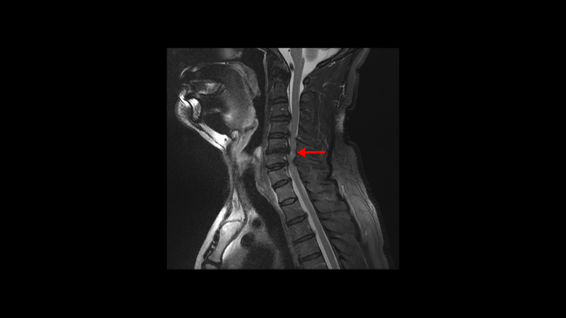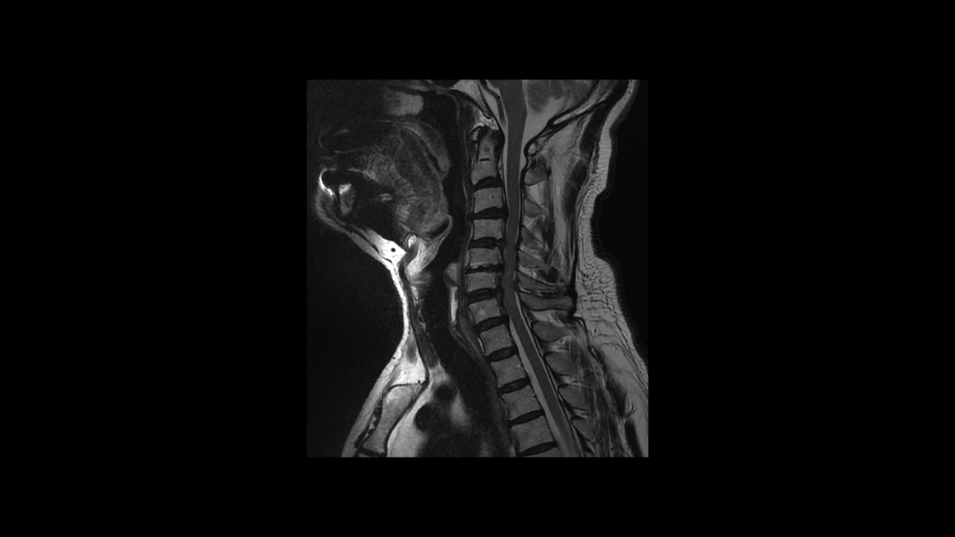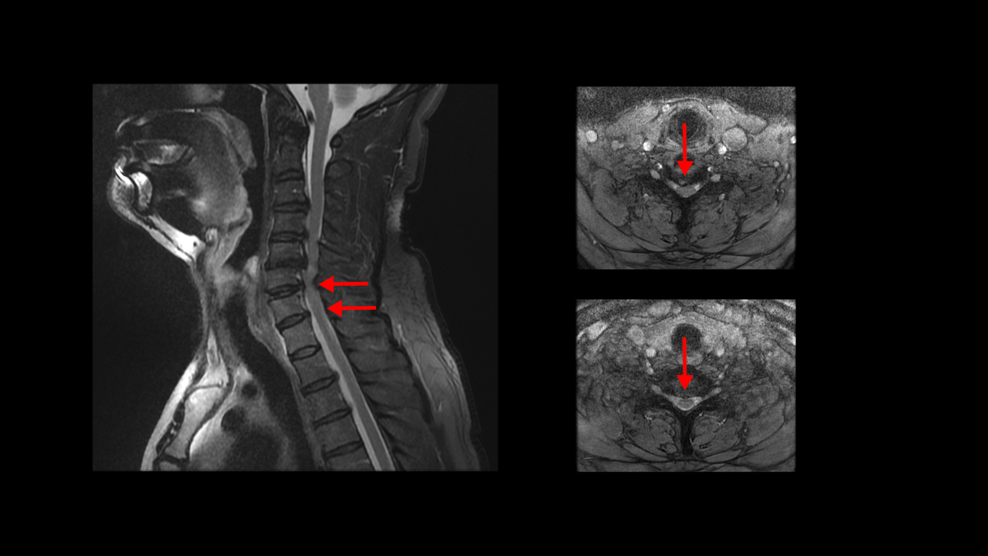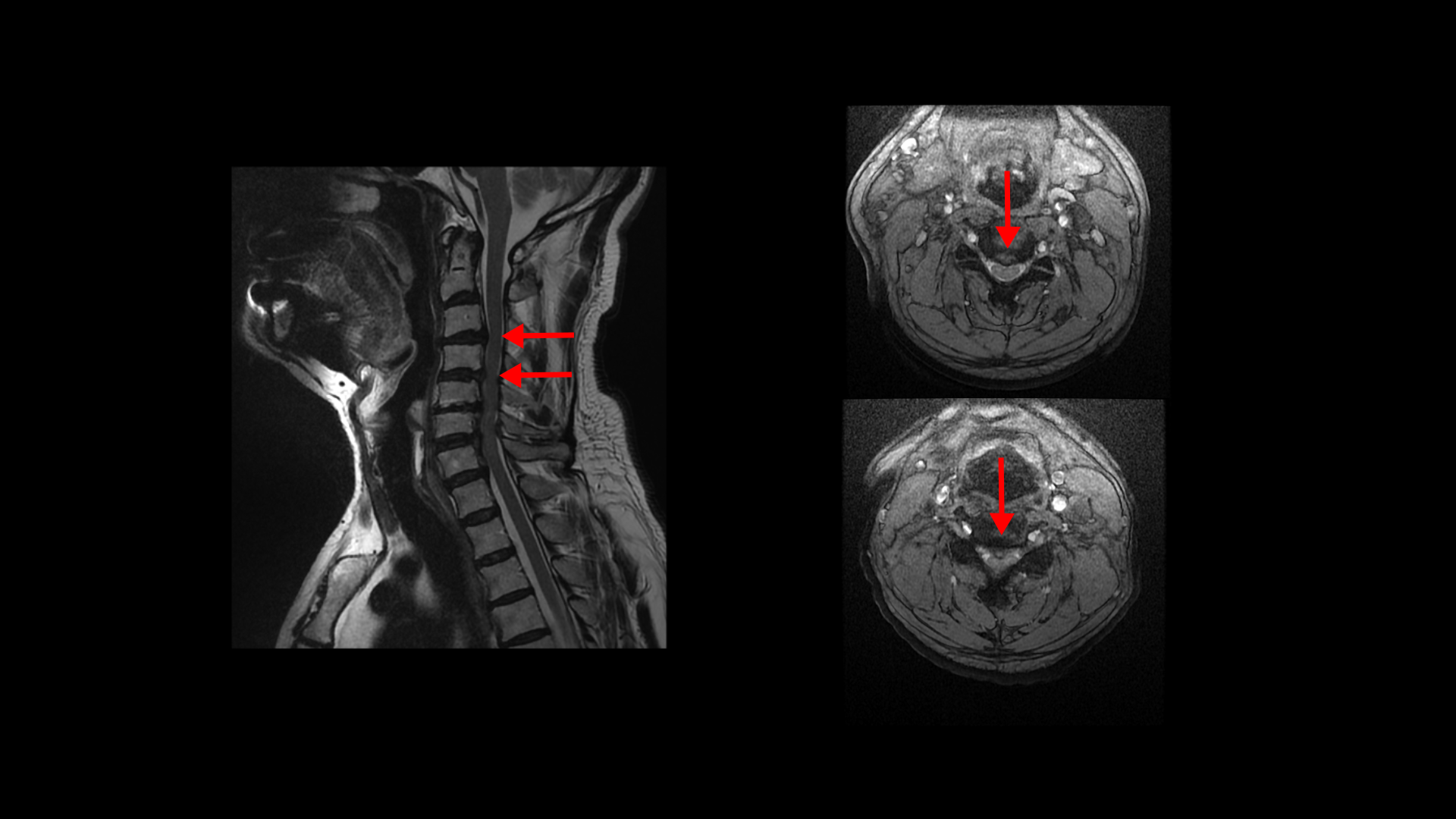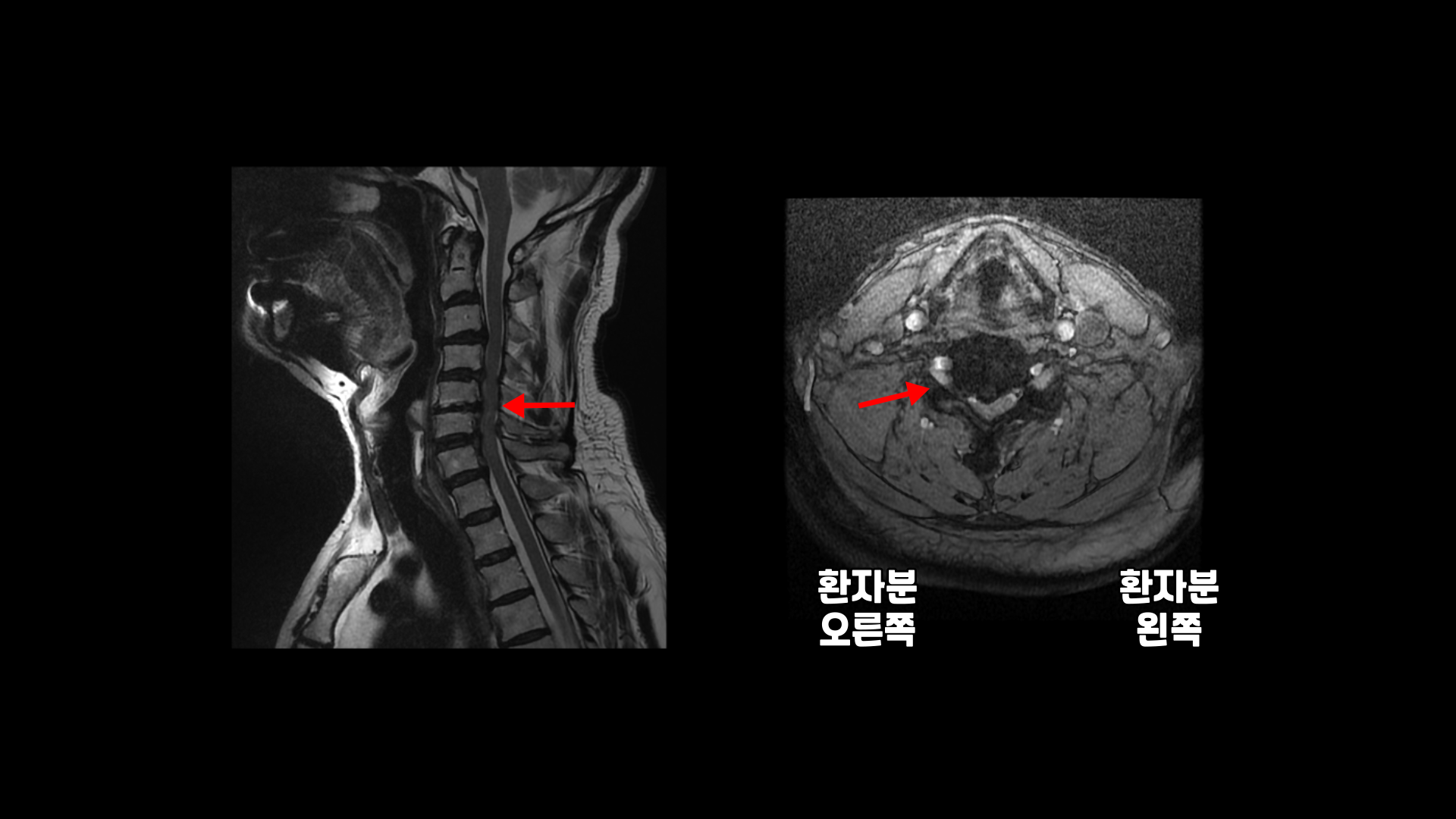 오른쪽으로 보시다시피 신경 나가는 길이 디스크와 협착으로 많이 막혀 있고 척수 신경에는 경추척수증, 즉 척수신경의 손상이 보입니다.