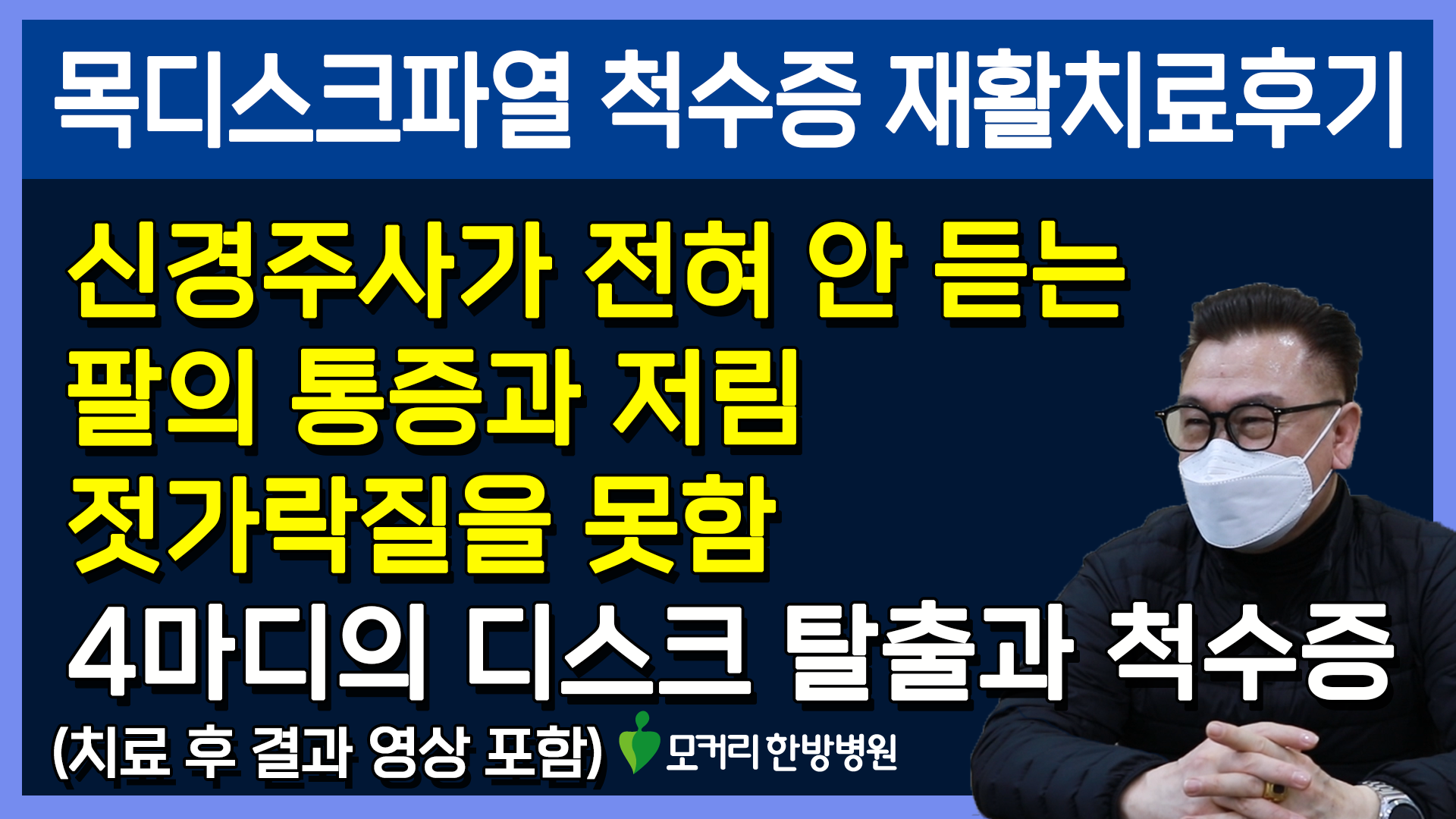 참고로 목디스크나 경추협착증, 척수증 등의 목 질환은 허리 질환과 달리 통원 치료가 가능한 경우가 매우 많습니다. 이 환자분도 통원 치료를 받으셨습니다. 또 목 질환에 대한 근육 재활치료의 장점은 치료가 허리보다 훨씬 더 빠르다는 겁니다. 이 환자분은 한쪽 다리에 오래된 저림 증상과 방사통이 있으셨습니다. 처음에 척수증 증상이 아닐까 해서 검사해봤는데 허리디스크 파열로 인한 다리 저림이었습니다. 목디스크를 치료하면서 동시에 허리도 치료해 드렸습니다. 이분의 목디스크와 협착의 치료 결과는 어떻게 되셨을까요? 환자분의 재활치료 결과가 궁금하시다면 아래 썸네일을 클릭해 모커리한방병원 홈페이지에 로그인하신 후 치료 후 결과 영상을 꼭 보시길 바랍니다.