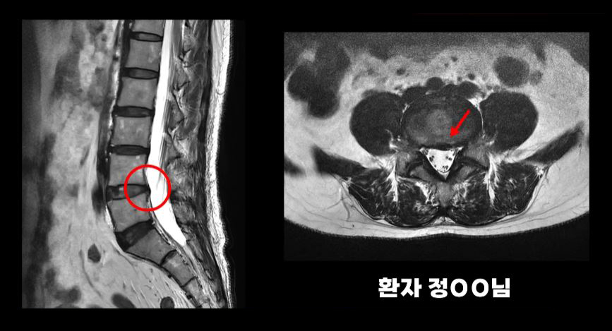 이분은 MRI상으로 신경 눌림이 그리 심해 보이지 않습니다. 그래서 여러 병원에서 디스크 문제가 아니라는 얘기를 들으셨는데, 이런 경우 디스크내장증이라고 말하는 의사들도 있습니다. 그런데 이 환자분은 근 감소와 근 기능 저하 등 근육 문제로 인한 심각한 근육성 방사통으로 원인이 밝혀졌고, 근육재활치료를 통해 좋아지셨습니다.