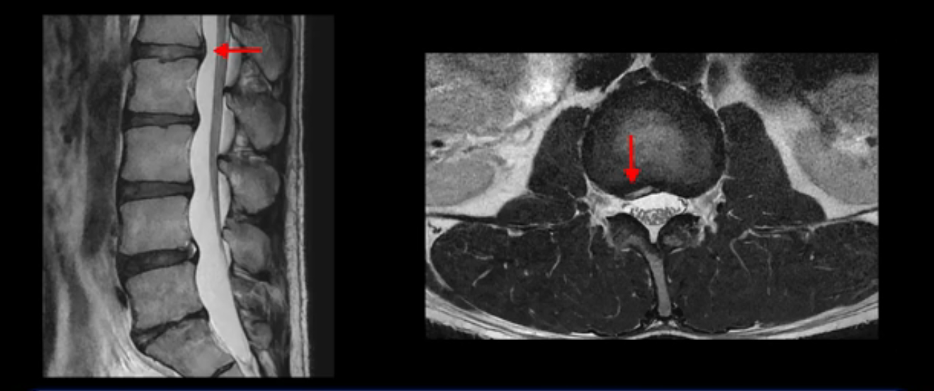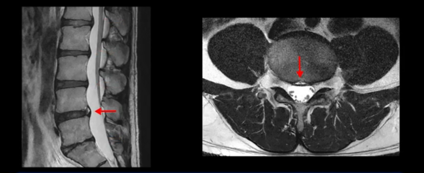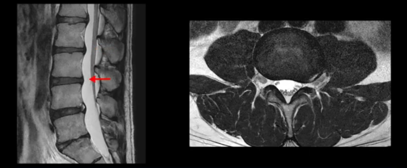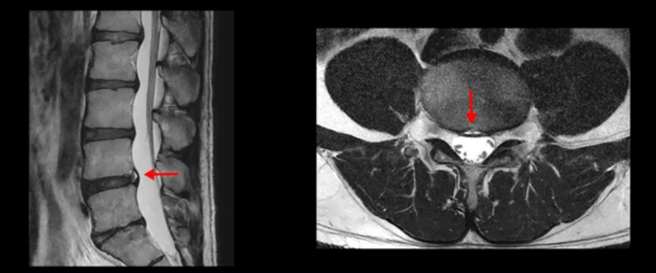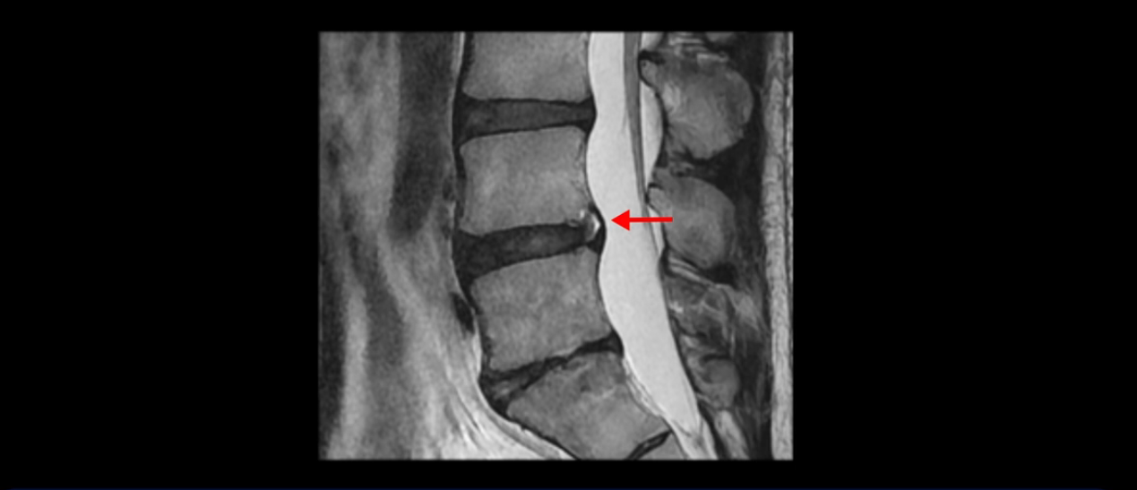 그런데 이분의 증상과 MRI가 전혀 일치하지 않는데, 왜 그런지 지금부터 자세히 설명드립니다. 이분 증상은 앉으면 엉치와 허리가 심하게 아파 10분 이상 앉는 게 어렵고 양쪽 발가락이 앉아있을 때나 누워있을 때 다 저립니다. 걸을 때도 아파서 10분 걷기도 어렵습니다. MRI를 마디마디 살펴보면 1번 2번은 오른쪽으로 살짝 밀려나온 디스크가 있지만 전혀 심하지 않고, 뒤에 또 설명하겠지만 최근에 밀려나온 급성 디스크가 아니고 오래된 디스크로 판단됩니다.