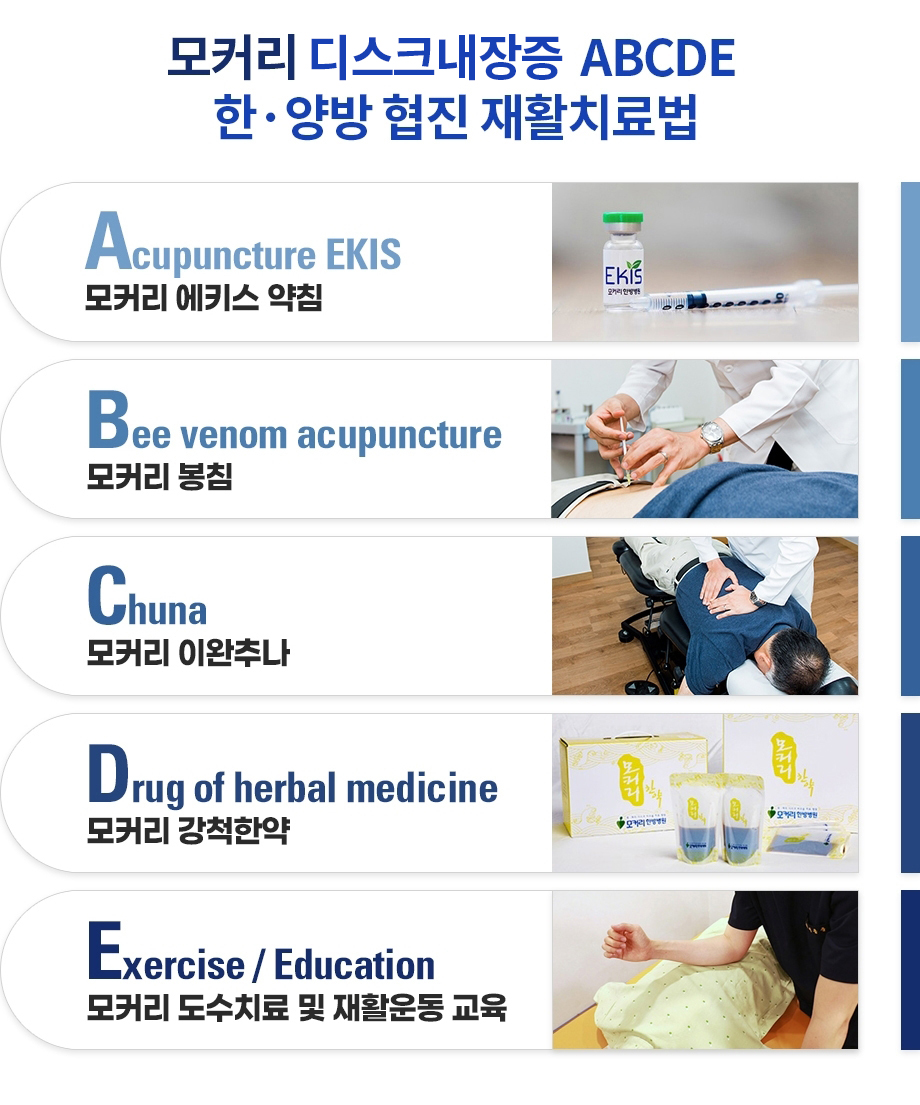 모커리 디스크내장증을 진단 받은 환자분들의 대부분은 허리 기능이 약화되어 있고 근기능 이상이 있게 때문에 허리기능을 재활하는 치료가 필요합니다. 활동량과 운동량을 줄이고 충분히 쉬며 한·양방 협진 복합 재활치료 및 가벼운 재활운동도 진행합니다.