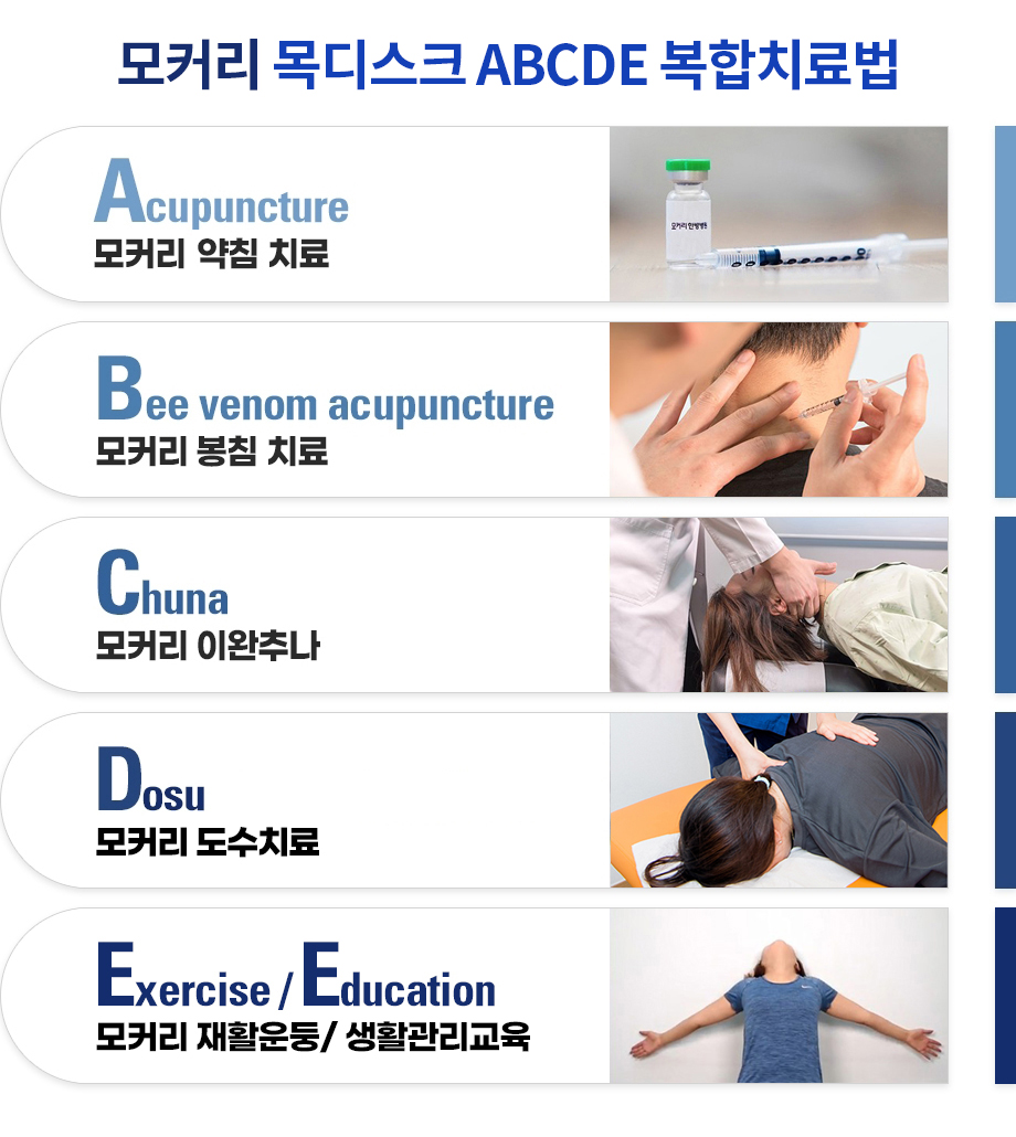 목디스크 치료방법 자세히 보기 >모커리 목디스크 ABCDE 복합치료법은 수술 없이 목디스크를 치료하는 모커리 고유의 비수술 치료방법입니다. 초기 목디스크는 물론 수술을 권유 받을 정도의 힘 빠짐이나 마비를 동반한 중증 목디스크까지 ABCDE 목디스크 비수술 치료법으로 치료하고 있습니다. 모커리는 일반적으로 목디스크가 허리디스크보다 비수술치료로 더 쉽고 빠르게 치료된다는 것을 연구하여 학술대회 등에 지속적으로 발표하고 있습니다.