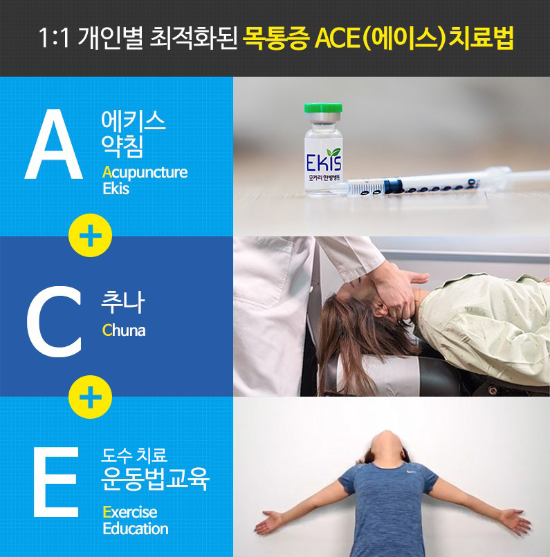 위에서 설명한 에키스 약침(Acupuncture of Herbal Medicine)과 이완추나(Chuna), 도수치료및 운동법 교육(Exercise Education)을 통합하여 경추통증 ACE(에이스) 치료법이라고 합니다. 이러한 ACE 치료법은 경추통증 치료에 효능이 있는 여러 치료법을 복합적으로 진행함으로써 치료 효과를 배가시킬 수 있습니다.