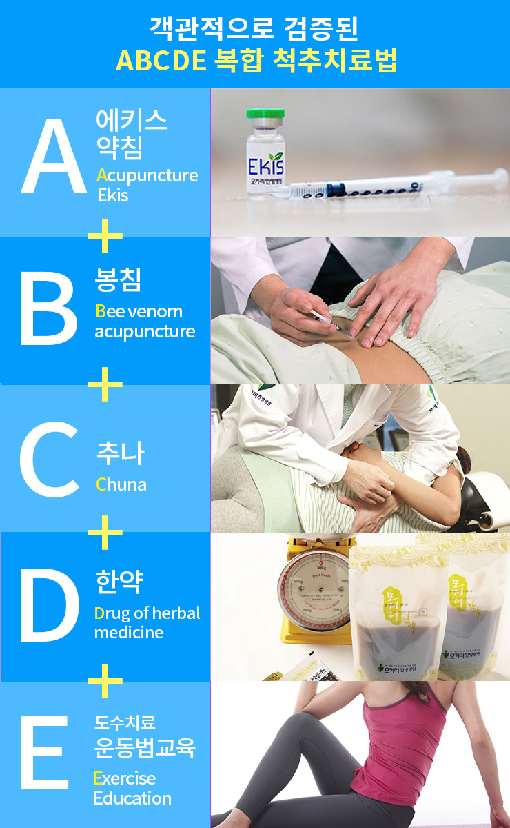에키스 약침(Acupuncture of Herbal Medicine) + 봉침(Bee venom acupuncture), 이완추나(Chuna) + 도수치료 및 운동법 교육(Exercise, Education)을 통합하여 ABCDE 복합척추치료법이라고 합니다. 이러한 ABCDE 복합척추치료법은 퇴행성디스크 및 척추관협착증 치료에 효능이 있는 여러 치료법을 복합적으로 진행함으로써 치료 효과를 배가시킬 수 있습니다.