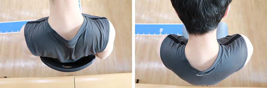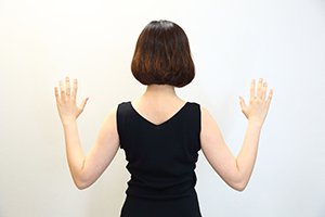 서 있을 때 손바닥 방향을 확인해보는 것으로 라운드숄더를 구분할 수 있습니다. 어깨가 일자로 펴진 상태라면 서 있을 때 손바닥은 몸 쪽을 향하게 됩니다. 그러나 어깨가 심하게 앞으로 말린 라운드숄더 상태라면 서 있을 때 손바닥이 뒤쪽을 향해 뒷모습을 봤을 때 손날이 아니라 손바닥이 보이게 됩니다.