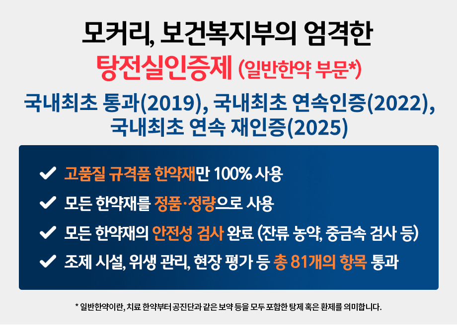 정확하고 엄격한 관리시스템으로 재배에서부터 철저하게 관리합니다. 모커리한약은 최고의 품질을 자랑하는 청정한약재를 사용합니다.