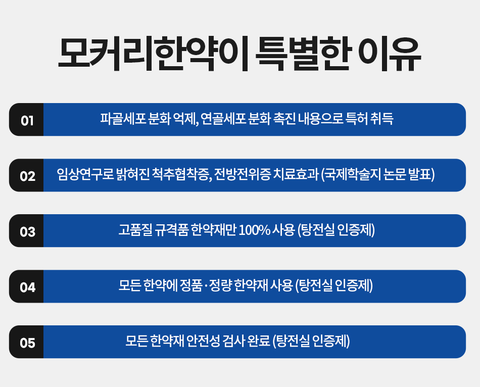 모커리 척추치료 한약은 염증제거, 신경기능 회복, 연골보호 및 뼈파괴세포 억제, 척추영양공급 및 혈관신생 촉진 등의 효과가 있습니다. 특허 받은 모커리 강척 한약의 척추치료 효과는, 모커리를 찾아주시는 수많은 환자분들께서 지금도 직접 경험하고 계십니다.