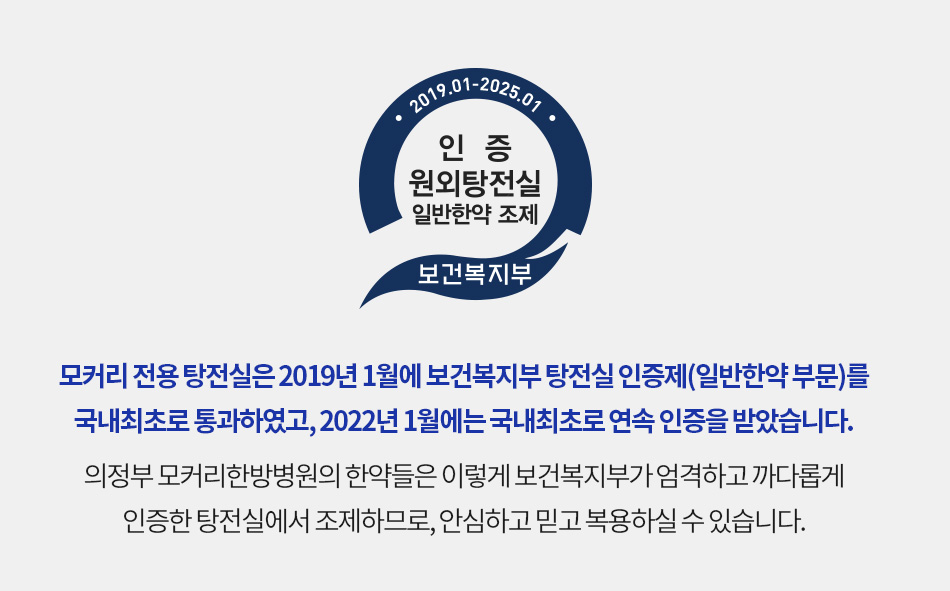 그래서 보건복지부에서는 한약의 품질과 안전성을 객관적으로 평가할 수 있는 ‘탕전실 인증제’를 2019년부터 시행하고 있습니다. 탕전실 인증제는 중금속 검사와 잔류농약 검사를 모두 마친 규격품 한약재들만 100% 사용해야 통과할 수 있습니다. 또한 한약의 조제와 보관부터 시작하여 포장, 배송 시스템까지 꼼꼼하게 갖추고 모든 과정의 위생을 철저하게 관리해야 합니다.
