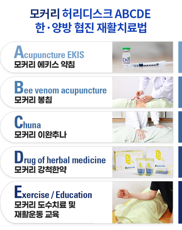 모커리 허리디스크 ABCDE 복합치료법은 수술 없이 허리디스크를 치료하는 모커리만의 고유의 비수술 치료방법입니다. 디스크 통증은 물론 수술을 권유 받을 정도의 마비와 힘 빠짐을 동반한 디스크 파열 등의 중증 허리디스크를 수술 없이 ABCDE 허리디스크 비수술 치료법으로 치료하고 있습니다. 모커리는 심하게 파열된 허리디스크뿐 아니라 수술 후 재발한 허리디스크, 척추유합술 후 재발한 허리디스크 등의 어려운 척추 질환을 비수술로 치료하고 있으며, 이러한 ABCDE 치료법의 효과를 과학적, 객관적으로 검증하여 미국통증학회(AAPM), 세계재활의학회(ISPRM) 등 해외 유명학회에서 발표하였습니다.