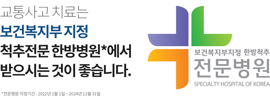 교통사고시 가장 많이 다치는 부위는 목과 허리입니다. 그러므로 목과 허리를 잘 알고 전문적으로 치료하는 곳에서 진단 및 치료를 받아보는 것이 좋습니다. 또한 수반되는 어깨, 무릎통증, 두통, 구토, 불안감 등 ...