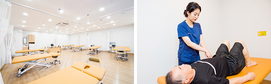 ● 많은 환자들을 한 번에 수용가능한 쾌적하면서도 넉넉한 공간의 물리치료실과 도수치료실이 구비되어 있습니다.
