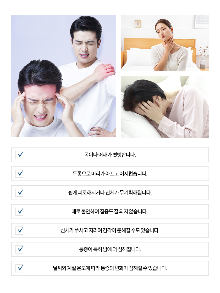 목과 허리 통증을 비롯한 어깨•무릎, 발목 등 전신에 걸친 통증과 두통, 손과 발 저림, 이명, 어지럼증, 메스꺼움, 소화불량 등의 증상 발생