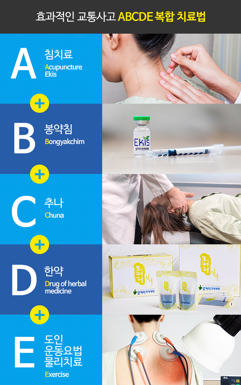 침(Acupuncture) + 봉약침(Bongyakchim) + 이완추나(Chuna) + 한약(Drug herbal medicine) + 한방물리치료 및 도인운동요법(Exercise)을 아울러 교통사고 ABCDE 복합치료법이라고 합니다. 이러한 ABCDE 복합 치료법은 교통사고 목통증 치료에 효능이 있는 여러 치료법을 복합적으로 진행함으로써 치료효과를 배가시킬 수 있습니다.