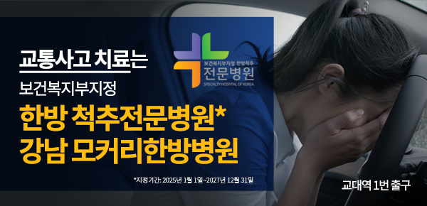 1. 교통사고 발생 시 가장 많은 통증이 발생하는 부위가 목과 허리, 어깨입니다. 특히 안전벨트를 착용해도 목은 고정되지 않기 때문에 교통사고 시 강한 충격으로 목이 필요 이상으로 과도하게 젖혀지고 구부러짐에 따라 목의 근육과 인대, 디스크 등 주변 조직이 손상을 입습니다. 또한 목과 연접한 어깨통증도 발생합니다. 이런 증상을 잘 볼 수 있는 곳이 한방 척추전문병원이며 보건복지부 지정 척추전문병원은 2025년 현재 강남 모커리를 포함하여 서울시 내 한·양방을 통틀어 단 6군데로 많지 않습니다. 보건복지부 지정 척추전문병원은 척추질환에 대해 난이도가 높은 의료행위를 하며 대학병원급의 의료서비스와 수준 높은 진료를 제공한다고 보건복지부로부터 지정 받는 것입니다. 교통사고 발생 시 기존에 디스크, 협착증, 일자목, 거북목 등을 가진 환자라면 가능하면 척추전문병원에서 치료 받으시는 것이 좋습니다.