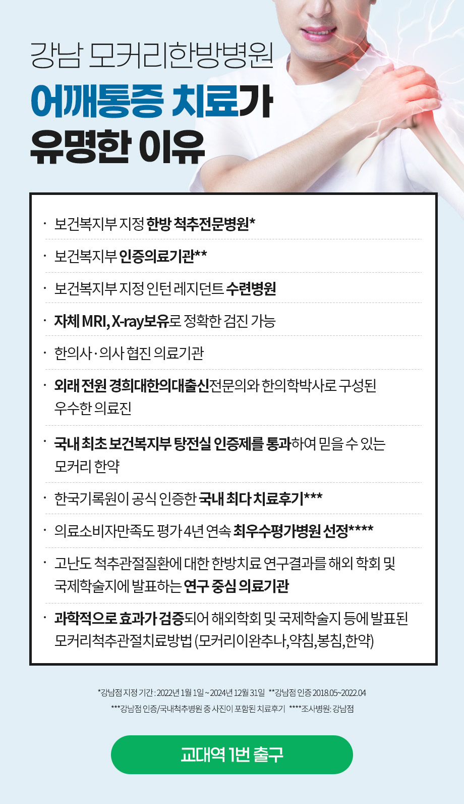 목디스크로 인해 어깨통증이 있는 경우에는 다른 어깨질환과의 감별진단을 잘 해야 합니다. 통증의 원인이 목디스크라면, 정확히 목디스크를 진단해서 치료해야 합니다. 저희 모커리한방병원은 목디스크의 치료가 일반적으로 허리디스크 치료보다 더 쉽고, 빠르다는 내용을 미국통증의학회에서 발표하였습니다.