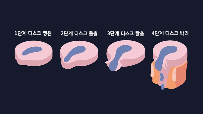 저희가 '허리디스크 파열, 터짐 왜 흡수되나요?' 영상에서 허리디스크는 심하게 터질수록 더 잘 흡수되는 경향이 있다고 말씀 드렸습니다. 디스크는 보통 심하게 밀려나온 정도에 따라 네 단계로 분류되는데요.