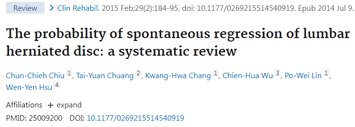 먼저 가장 초기 단계인 1단계가 디스크 팽윤입니다. 디스크 팽윤은 디스크의 퇴행성 변화로 인해 디스크 팽창이 일어나 완만하게 튀어나온 상태를 말합니다. 다음 2단계는 디스크 돌출입니다. 디스크 수핵이 밀려나오며 디스크 외피, 즉 섬유륜을 손상시켰지만 그 수핵이 디스크 섬유륜의 외부까지 찢고 나오지는 않은 상태입니다. 3단계는 디스크 탈출입니다. 디스크 탈출은 디스크의 섬유륜이 완전히 찢어져서 수핵이 밖으로 밀려나온 상태입니다. 일반적으로 디스크가 터졌다라고 표현하는 단계가 이 단계입니다. 가장 심한 4단계는 디스크 박리입니다. 디스크가 완전히 파열되어 수핵이 심하게 밀려나와서, 수핵의 일부가 아예 본체로부터 떨어져 나온 상태를 말합니다. 그럼 이렇게 심한 정도에 따라 분류된 디스크가 각각 흡수될 확률은 얼마나 될까요? 몇 년 전, 이러한 디스크 단계별로 각각 흡수율이 어떻게 되는지 연구된 체계적 문헌고찰 논문이 발표됐습니다. 이 논문은 높은 수준의 신뢰할 수 있을 만한 논문입니다. 이 연구 내용에 기반해서 설명해드리겠습니다.