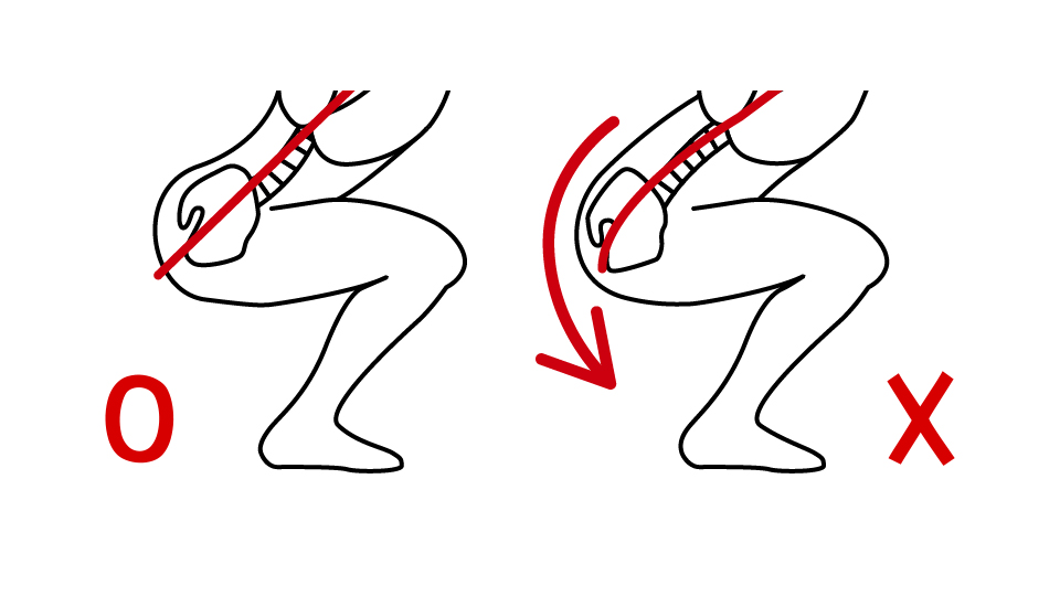 그 상태에서 일반 스쿼트를 할 때와 똑같이 경추, 흉추, 요추가 구부러지지 않게 일직선을 유지한 상태로 앉아주면 됩니다. 이 와이드 스쿼트의 가장 큰 장점이 앉는 깊이를 조금 깊게 해도 앞서 설명 드린 허리의 구부림, 즉 벗윙크가 잘 발생하지 않는다는 것입니다. 왜 그럴까요?