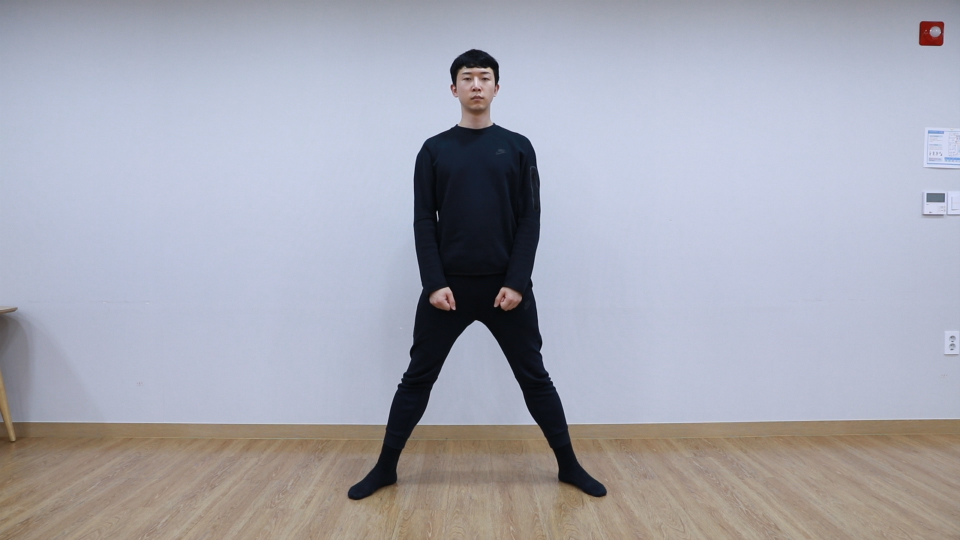 우선 다리를 일반적인 스쿼트를 할 때보다 더 넓게 벌리고 섭니다. 어깨 넓이보다 더 넓게 서는 겁니다.
