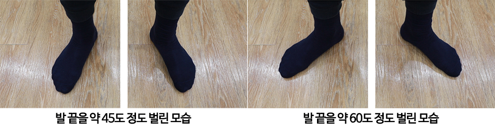 이때 양쪽 발끝은 약 45도 정도에서 많게는 60도 정도 바깥으로 벌려줍니다.