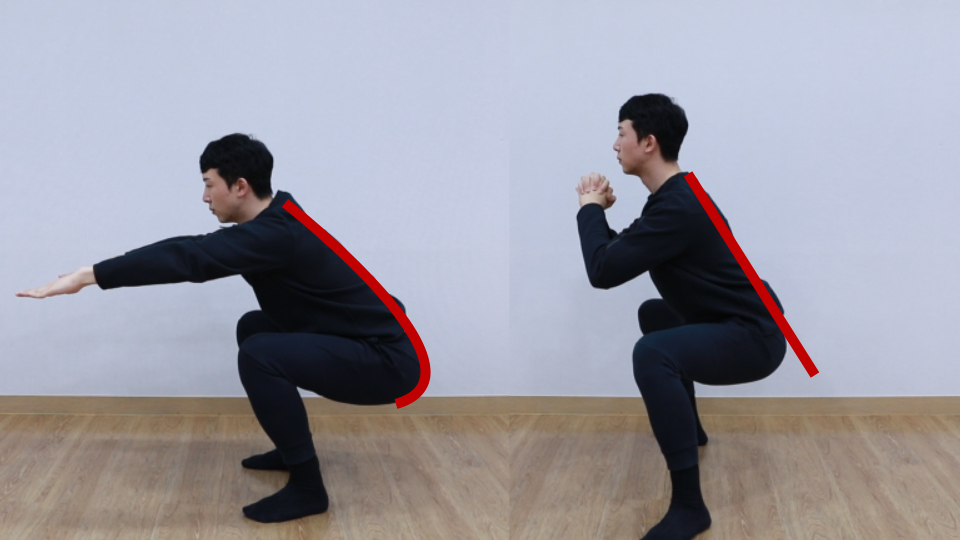 위 이미지를 통해 스탠다드 스쿼트와 와이드 스쿼트를 비교해보겠습니다. 왼쪽의 스탠다드 스쿼트를 보시면, 엉덩이가 뒤로 훨씬 더 많이 빠지고 상체도 더 많이 기울어지는 걸 볼 수 있습니다. 스탠다드 스쿼트를 할 때는 와이드 스쿼트를 할 때보다 허리 뒤 근육과 엉덩이 근육, 햄스트링 근육이 훨씬 더 많이 늘어나야 하기 때문에 앉는 깊이를 깊게 할수록 허리가 구부러지기 쉽고, 허리에 더 많은 부담이 가게 됩니다.