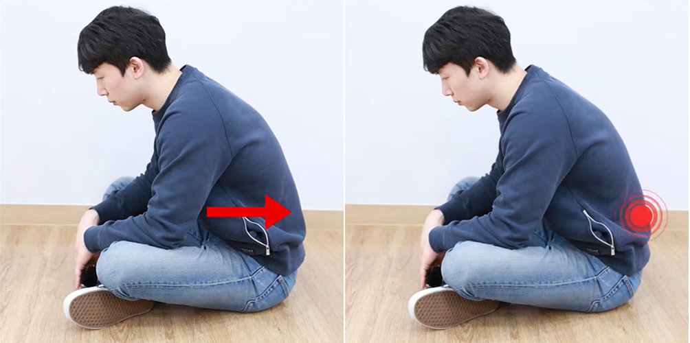 위 이미지를 보시다시피 양반다리로 앉게 되는 순간, 우리 몸의 상체가 구부러지고 허리가 뒤로 빠지면서 그 즉시 요추 후만 자세가 됩니다. 이 때문에 허리 뒤쪽에 위치한 근육과 인대, 디스크 등에 매우 큰 하중이 가해지면서 디스크가 손상될 위험이 있습니다. 따라서 디스크 환자라면 가급적 방바닥에 앉는 것은 피하시길 바랍니다.