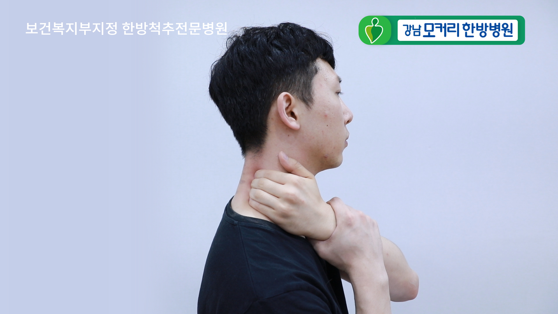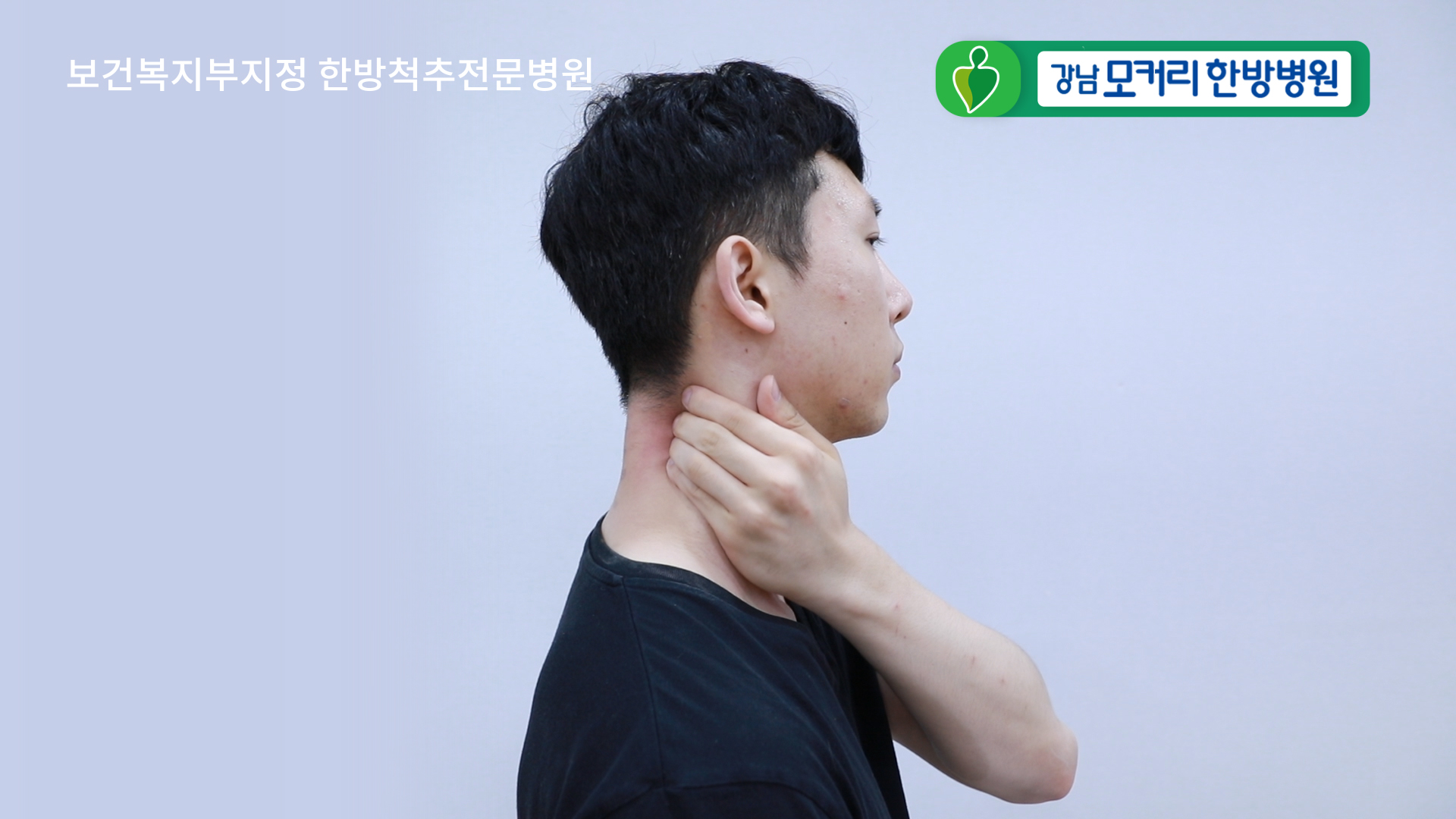 세 손가락 끝으로 경추 오른쪽을 꾹꾹 눌러보면서 통증이 있는 부위를 찾아보시고, 만일 누르는 힘이 좀 부족하다 느끼면 오른손으로 왼손 손목 부위를 받쳐주면서 눌러주시면 됩니다.