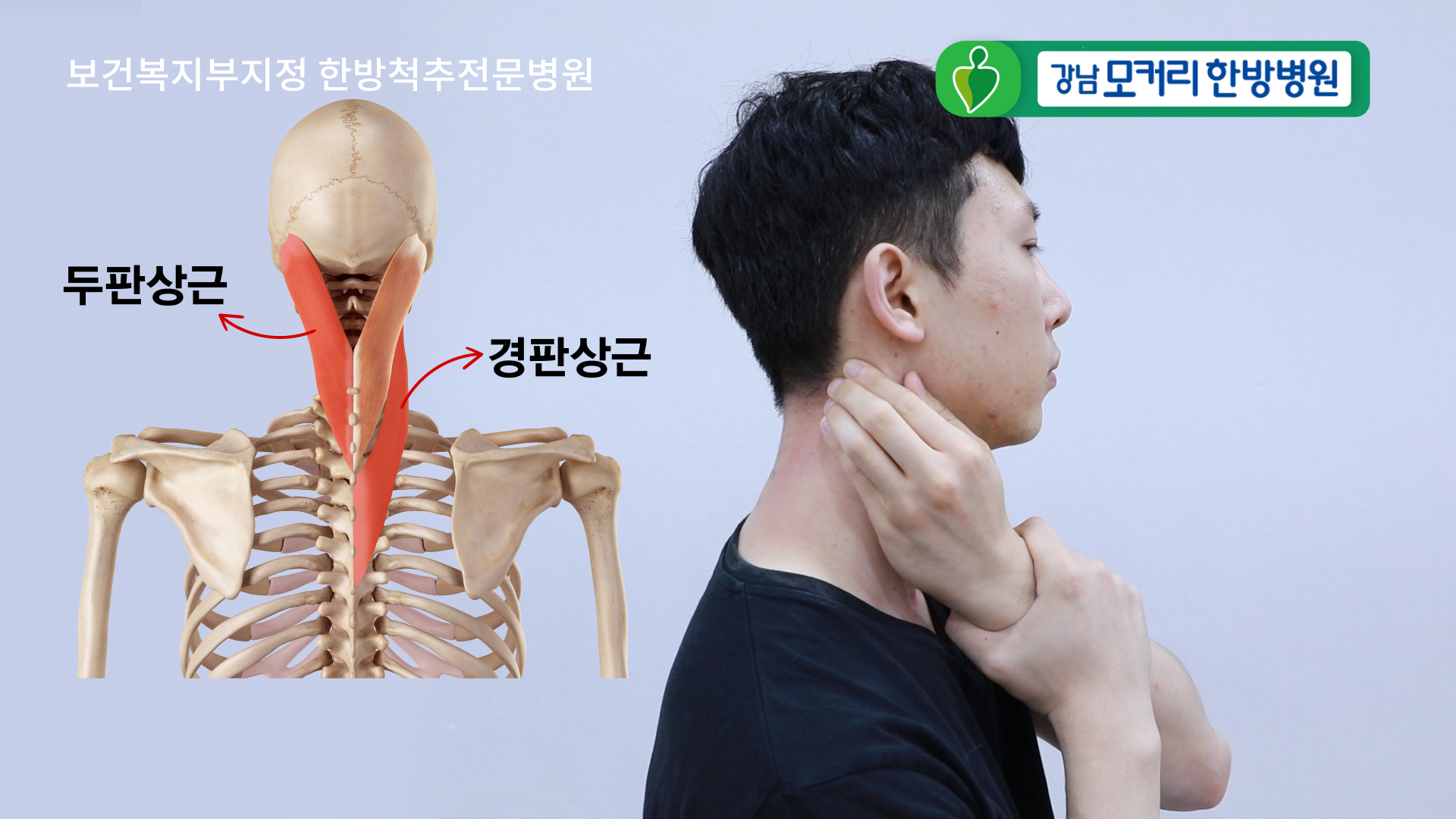 두판상근과 경판상근을 마사지하는 방법은 목 맨 위에서 목 맨 밑까지 위아래를 오르내리면서 두판상근과 경판상근의 아픈 부위를 찾습니다.