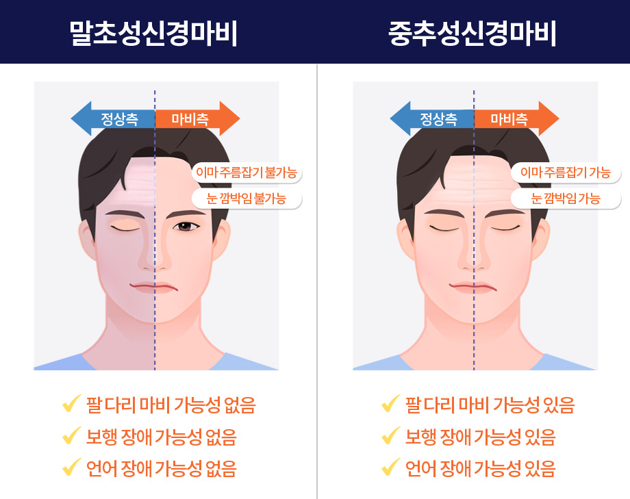 중추성 마비는 주로 뇌졸중(뇌출혈, 뇌경색)으로 발생하며 뇌졸중 외에도 뇌종양, 뇌염이 뇌실질 내의 얼굴신경 경로를 침범한 경우 중추성 얼굴신경마비가 나타날 수 있습니다. 중추성안면마비는 말초성안면마비와 달리 얼굴뿐만 아니라 팔, 다리 편측에 마비가 발생할 수 있습니다. 이 외에도 언어장애, 시각장애, 어지럼증, 구역질, 두통 등이 발생할 수 있습니다.