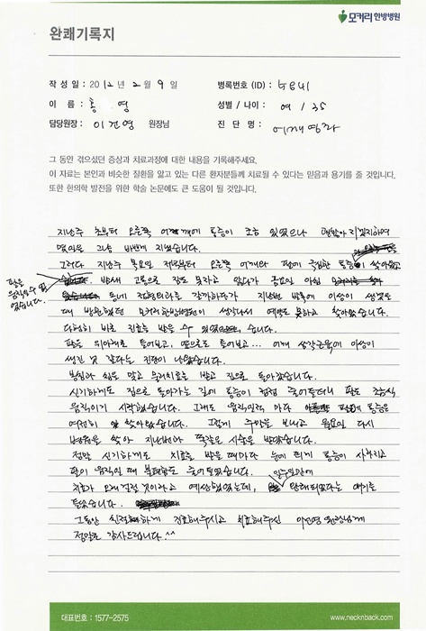 작년 8월말 길에서 보도블럭을 못보고 걸려서 심하게 넘어졌습니다. 그때부터 목 어깨도 아프고 왼팔이 많이 저리고, 허리도 무릎도 아팠습니다. 그래서 00한방병원과 정형외과에서 엑스레이 검사를 하였고, 다행히 뼈에는 이상이 없다고 들었습니다. 한방병원과 정형외과에서 침치료, 물리치료, 주사 등을 맞았지만,...