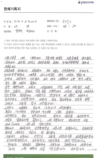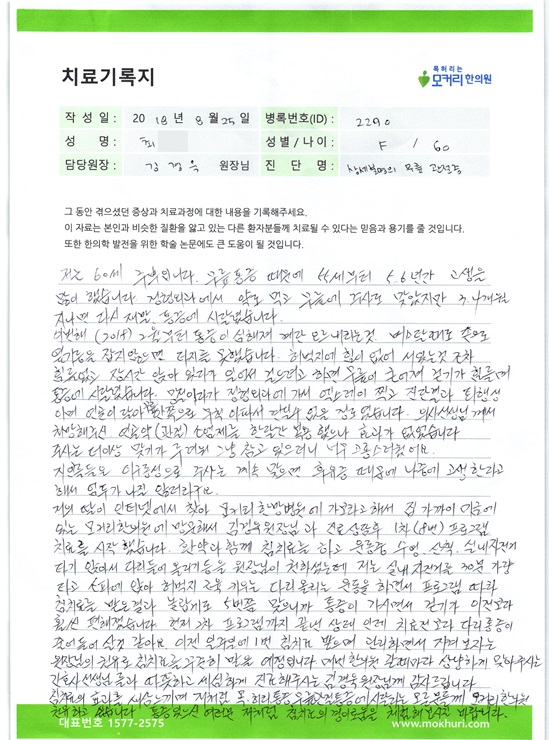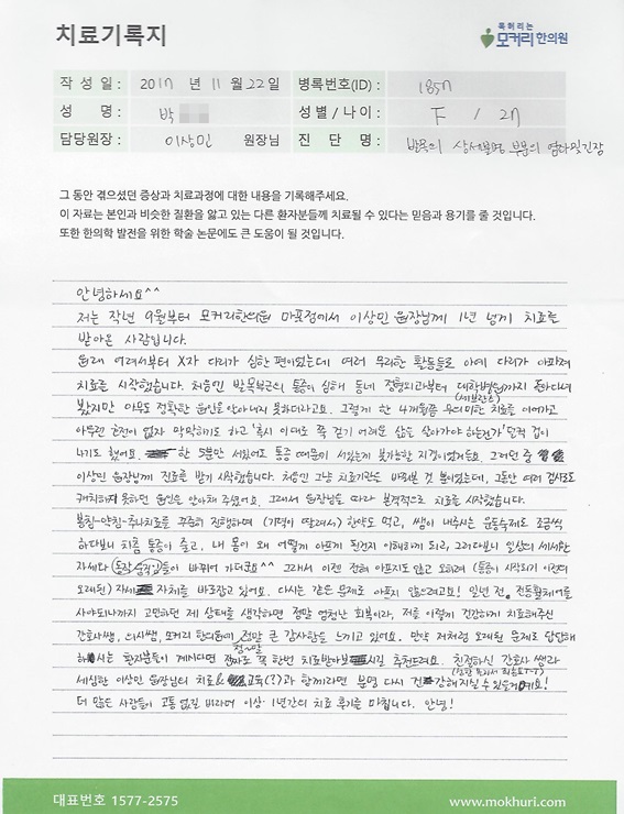 안녕하세요? 저는 지난 2022년 5월초 퇴행성관졀염의 치료를 위한 오른쪽 무릎수술 후 집에서 회복 중에 생긴 허리와 오른쪽 다리의 갑작스러운 통증으로 걷지 못해 7월 15일 입원하게 된 50대 후반의 환자입니다. 평소 한의원의 이용이 많은 편이 아니어서 반신반의했지만 워낙 통증이 심해 무엇보다 화장실 ...