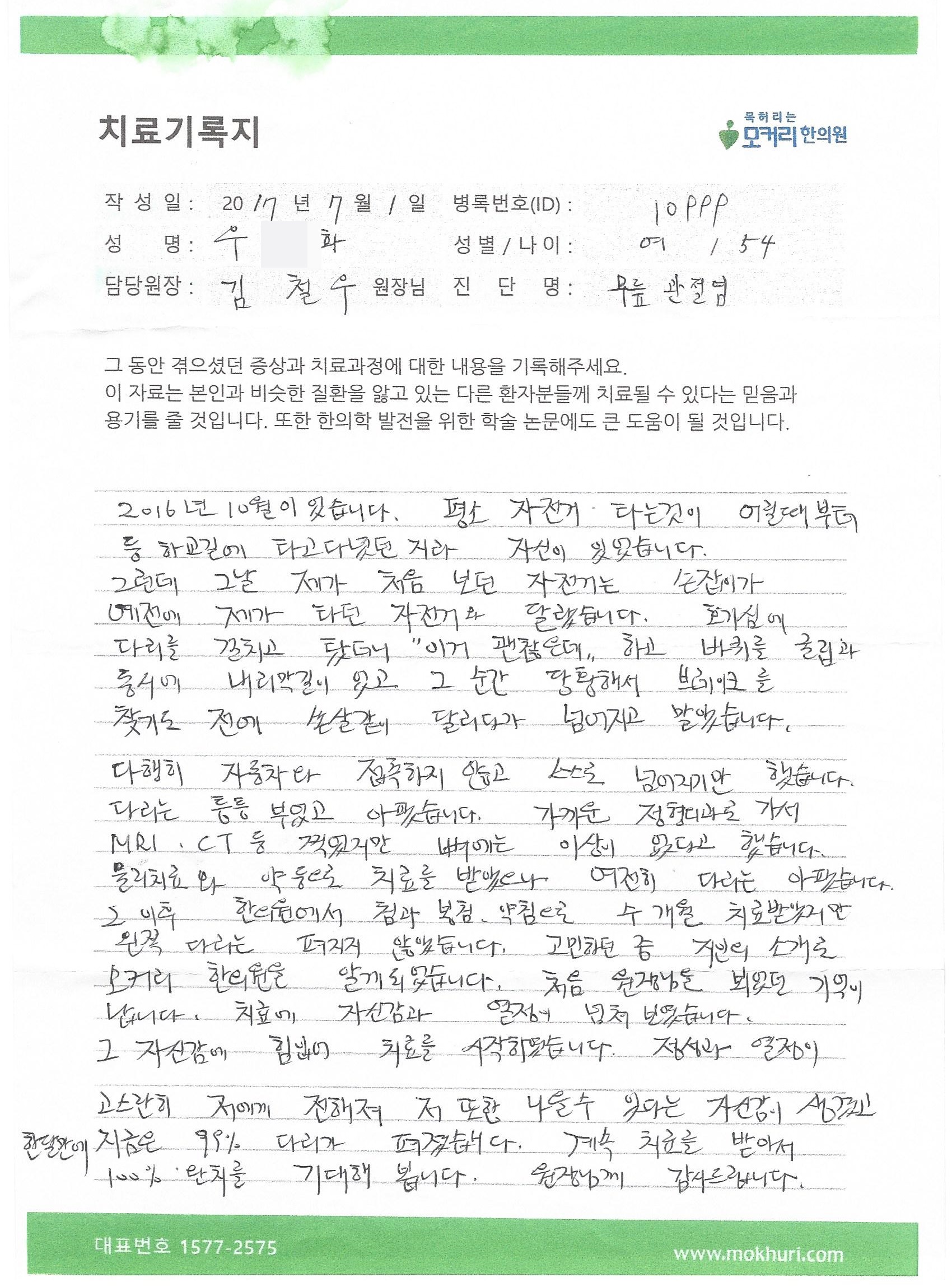 작년 2월경에 스포츠센터에서 운동하다가 심하게 넘어져서 오른쪽 무릎이 깨져 정형외과에서 수술을 하였으나, 통증은 그대로여서 힘들게 생활하던 중에 친구가 성남모커리한의원 김철우원장님을 소개시켜줘서 방문하게 되었습니다.