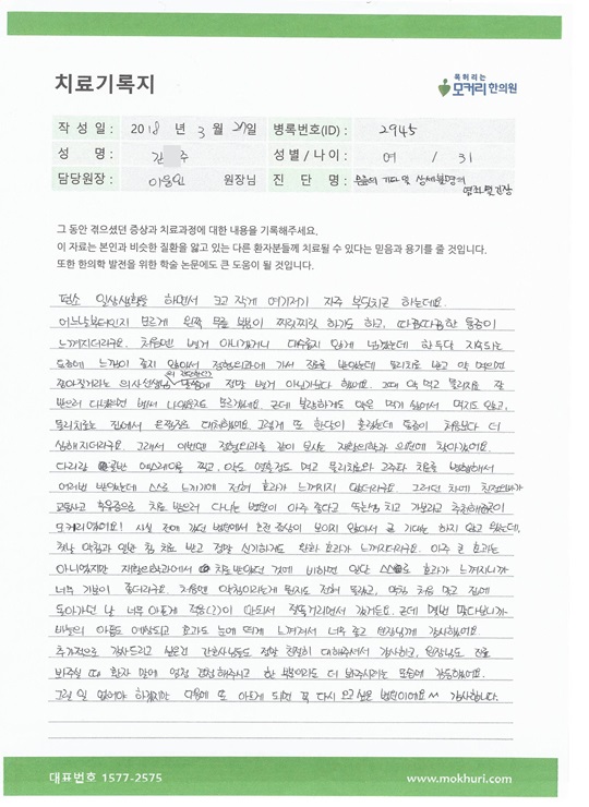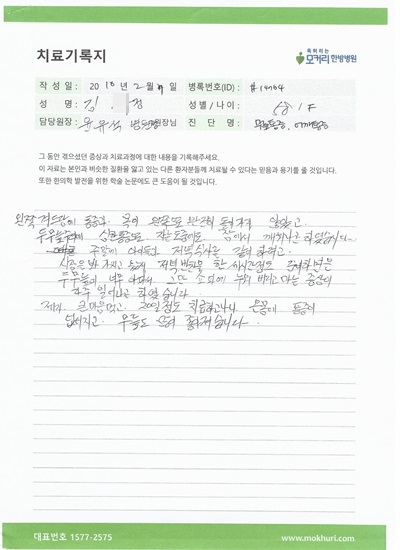 고관절, 대퇴, 무릎통증으로 발끝까지 한쪽 다리 시림과 저림으로 고통받다가 도곡동 모커리한방병원에서 검진 후 입원하여 치료를 받게 되었습니다.