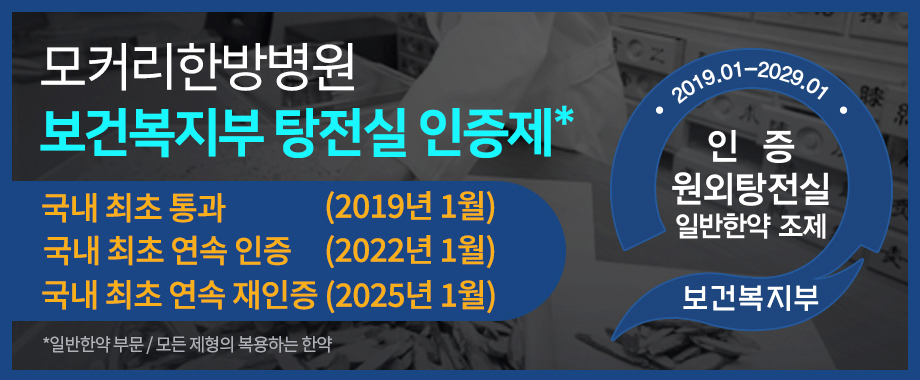 환자의 눈으로는 사용된 한약재의 품질이나 한약재의 정품여부, 정량사용, 안전성, 조제방식 등을 정확히 알기 어렵습니다. 이런 다양한 부분을 철저히 평가하여 믿을 수 있도록 인증하는 것이 바로 보건복지부 탕전실 인증제입니다. 모커리는 이렇게 좋은 품질의 한약을 만들기 위해 개원 초부터 부단히 노력해왔으며 이러한 노력들을 인정 받아 보건복지부 탕전실 인증제를 국내 최초통과(2019년 1월) 및 국내 최초 연속인증(2022년 1월)을 획득했습니다.