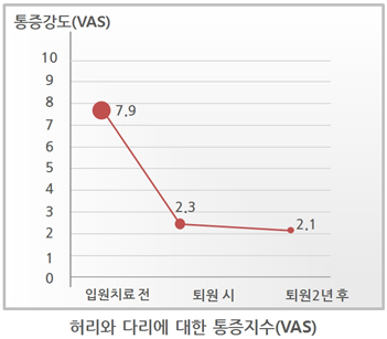 모커리한방병원은 2013년 1월부터 2014년 3월까지 척추전방전위증으로 입원한 환자를 대상으로 치료 전•후를 비교 분석한 결과, 복합척추치료 약 3주 후 환자가 느끼는 허리와 엉덩이 통증에 대한 통증지수는 7.1에서 3.1로 줄었으며, 통증 없이 걸을 수 있는 거리 역시 193m에서 3배가량 증가한 568m로 증가하였습니다. 이번 연구결과를 계기로 50% 밀려나간 2단계의 척추전방전위증 환자들에 대해서도 수술없이 충분히 치료될 수 있다는 것이 객관적으로 검증되었습니다.
