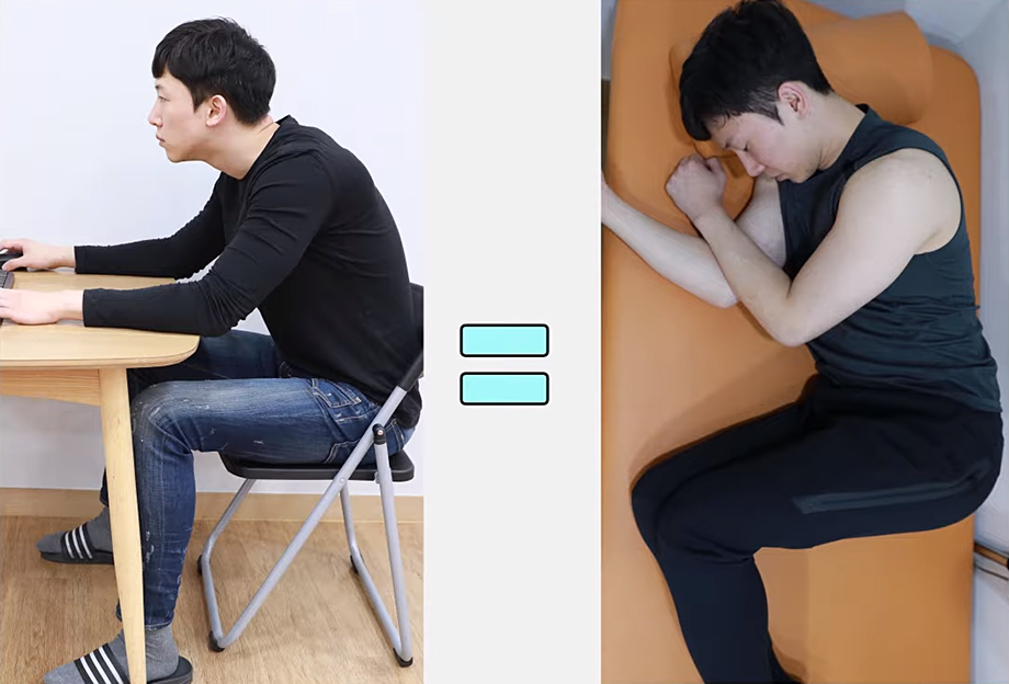 위 사진을 보면 낮에 업무를 보면서 앉아있는 자세와 밤에 잠을 자는 자세가 똑같습니다. 하루 종일 의자에 앉아있다가 밤에 잘 때도 마치 앉아있는 자세처럼 웅크리고 자는 것입니다. 원래 정상적인 수면 자세는 반듯하게 누워서 자는 것인데, 이미 장요근이 짧아져 있고 굳어 있는 분들은 반듯하게 다리를 펴고 누우면 장요근이 늘어나야 되니까 불편감을 느끼게 됩니다. 즉 근육이 이미 장요근이 짧아진 상태에 적응해버려서 새우잠 자세로 자는 것이 정상이고, 이게 휴식이라고 인지하게 되는 것입니다.