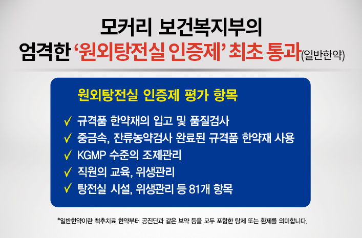보건복지부의 엄격한 원외탕전실 평가인증제(일반한약)을 통과하여 고품질의 한약을 조제하고 있습니다.