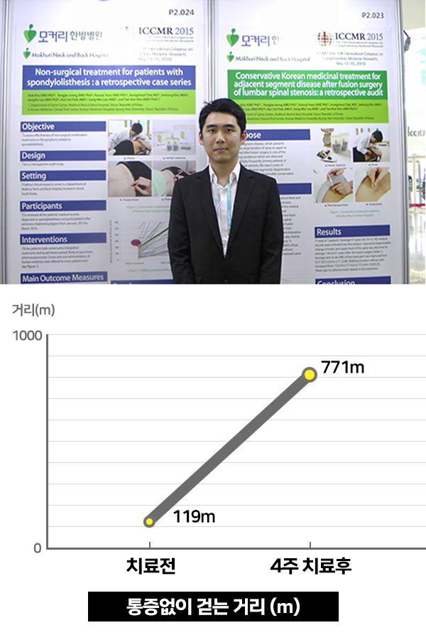 척추유합술 후 수술한 부위의 위아래의 인접부위에서 새로운 퇴행성 척추관협착증이 발생된 환자를 대상으로 4주간 입원집중치료를 실시한 결과, 요통 및 하지 방사통 지수(NRS)가 6.5에서 2.7로 감소되었으며, 통증 없이 걷는 거리(m)는 119m에서 771m로 6배 이상 증가한 것을 확인했습니다. 척추유합술 후 유합된 뼈마디 위아래의 마디에서 새로운 퇴행성 척추질환으로 고생하고 있는 환자들에게 또다시 수술을 받지 않아도 잘 치료될 수 있다는 것을 보여주는 연구결과입니다.