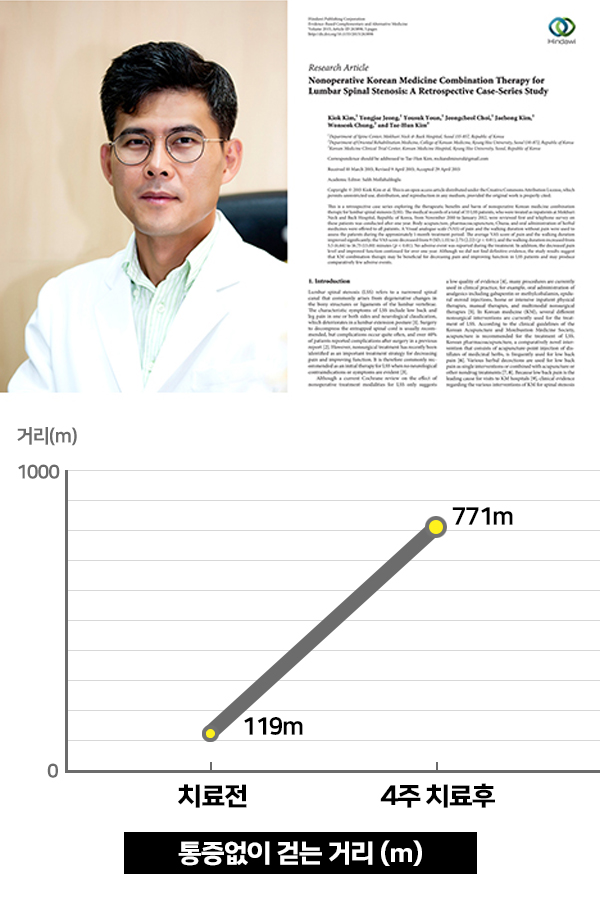 척추관협착증 환자들을 대상으로 한방입원치료를 시행한 결과 허리통증 및 다리통증지수가 9에서 2.7로 크게 감소하였고, 통증없이 걷는 시간은 5.5분에서 16.5분으로 약 3배 이상 증가했다는 내용이 담겼습니다.