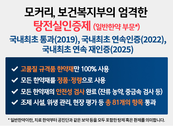 모커리한방병원의 공진단은 인증 받은 정품 사향을 사용하여 보건복지부의 엄격한 탕전실 인증제 일반한약 부문(규격품 한약재 사용, 위생적인 시설, 철저한 조제 관리 등)을 국내 최초로 통과한 모커리 전용 탕전센터에서 꼼꼼하고 철저하게 만들었기에 믿고 드실 수 있습니다. 탕전실 인증제란 한약 조제 과정의 안전성과 신뢰성을 검증하기 위해 2019년 보건복지부가 도입한 제도로 정부가 탕전실의 시설과 위생관리 및 규격품 한약재 사용 등의 항목을 매우 까다롭게 평가하고 있습니다. 정기적으로 ‘100% 표준 정품 약재를 썼는지’ 확인하기 때문에 보건복지부 탕전실 인증제를 통과했다면 정품 사향을 사용하는 곳이 확실한 것입니다.