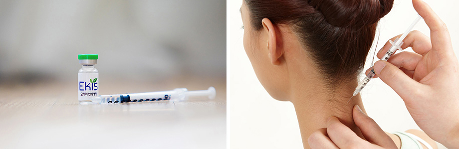 굳고 긴장된 목 주변 근육과 인대에 침을 놓아 자극을 줌으로써 뭉친 근육을 풀어주고 혈액순환을 활발하게 만들어 통증을 감소시켜주며, 근육과 인대를 유연하게 만들어 줍니다. 또한 특허 받은 한약을 정제한 약침액을 통증을 일으키는 경혈에 직접 주입해 염증 및 통증을 감소시키고, 손상된 근육과 인대의 기능 회복 및 강화에 도움을 줍니다.